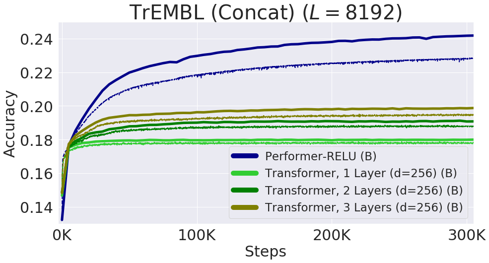 在最大长度达 8192(通过连接单个蛋白质序列获得)的序列上的性能表现。为适应 TPU 内存,减小了 Transformer 的大小(层数和嵌入尺寸)