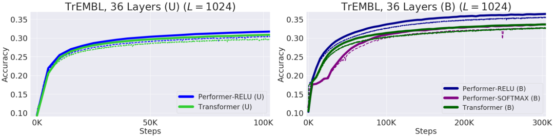 在使用 10 亿单词基准 (LM1B) 数据集时,我们将原始的预训练 Transformer 的权重迁移至 Performer 模型,获得了 0.07 的初始非零准确率(橙色虚线)。但是,在微调之后,Performer 的准确率只需用原始梯度步数的一小部分即可迅速恢复