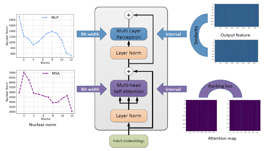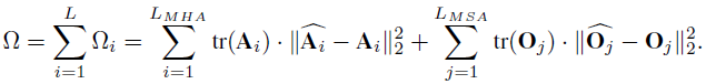 自注意力层是 Transfomer 结构中十分重要的部分,也是 Transformer 与传统卷积神经网络不同的地方。对于自注意力层,研究者发现量化使得注意力特征的相对顺序变得不同,会带来很大的性能下降。因此,他们在量化过程中引入了一个排序损失: