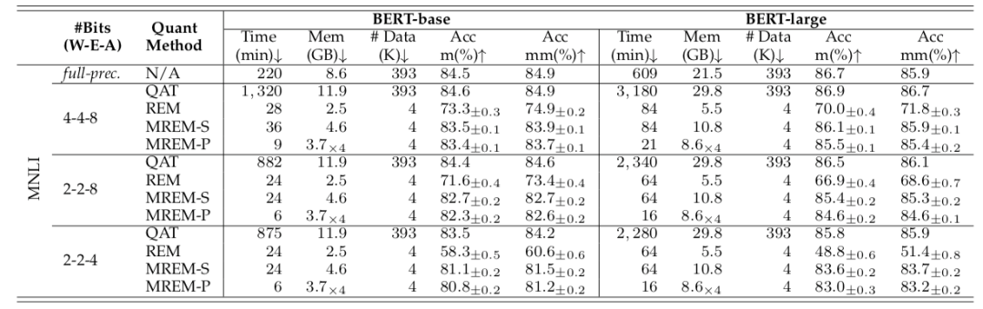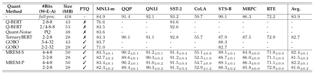 研究者同时在 GLUE 上与现有的其他算法进行了对比。如下表所示,本文的方法 (MREM-S 和 MREM-P) 比后量化方法 GOBO【4】取得更好的效果,甚至在多个任务上接近量化感知训练方法 TernaryBERT。