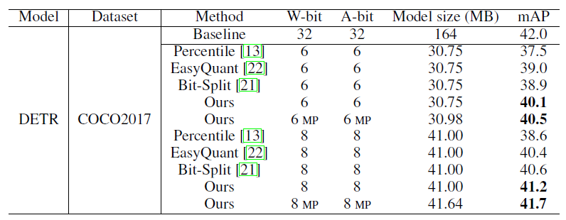 ,其中在 COCO2017 数据集上,对 DETR 进行量化,8bit 模型的性能可以达到 41.7 mAP,接近全精度模型的性能。