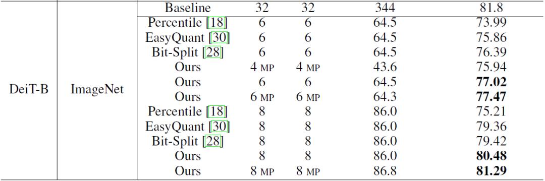 。从下表可以看出,在 ViT(DeiT)经典 transformer 模型上,论文的量化算法均优于之前的卷积神经网络量化算法【1】【2】。例如,在 ImageNet 数据集上,量化 Deit-B 模型也取得了 81.29% 的 Top-1 准确率。