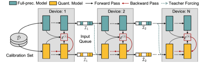 与逐个模块化重构量化误差不同,后量化还可以并行化训练。研究者把每个切分后的模块可以放在不同的 GPU 上,在不同模块之间设置输入缓冲池(input queue)