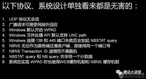 我刚才讲了软件设计问题、协议设计问题。下面讲的问题既涉及系统设计,同时又涉及协议设计,而且是多个协议设计,是一个多点综合性的耦合问题。这是我去年发现的,我起了一个名字叫BadTunnel。我这里列了9点,是既往的协议和系统设计,它们诞生的时间点不一样,是由不同的公司不同的人在不同的时间去设计出来的。每个设计独立去看可能没有太大的问题,甚至是很有必要的。但是这九个设计综合在一起的时候引发了一个非常严重的安全问题,从Win95影响到Win10。当时外媒报道它时甚至说是“有史以来最严重的视窗问题”。这九点协议协同工作的过程很复杂,大家可以看一下这个动画。在这个协同过程当中,存在一个非常小的缝隙,它不是一条直的路线,是非常弯曲的路。但是你只要找到它顺着走下来,最终可以实现劫持被攻击者的通信流量,窃取数据,甚至植入病毒。