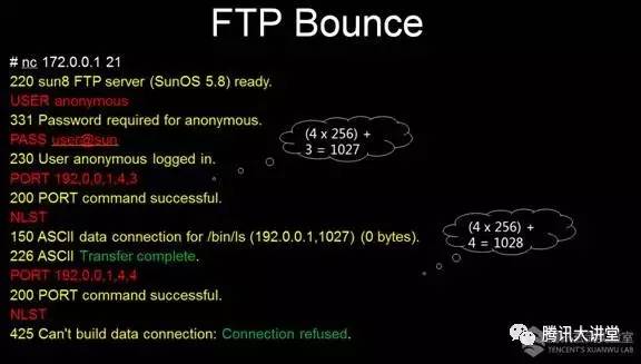 如果我们再给它指定另一个端口。这里用1028端口。但是1028端口是关闭的,我们相应的可以看服务器给我们反馈连接失败。在这个过程当中,我们实现了通过这台FTP服务器,间接连接到了一台我们根本没有办法触碰的内网机器,而且探测出那台机器的某个端口是开放或者关闭的,实现了端口扫描。实际上不止扫描,用这个技术还可以发起攻击。它影响了自己的安全吗?没有,但是它会影响身边其他服务器的安全性。这是一个很典型涉及协议的耦合问题,