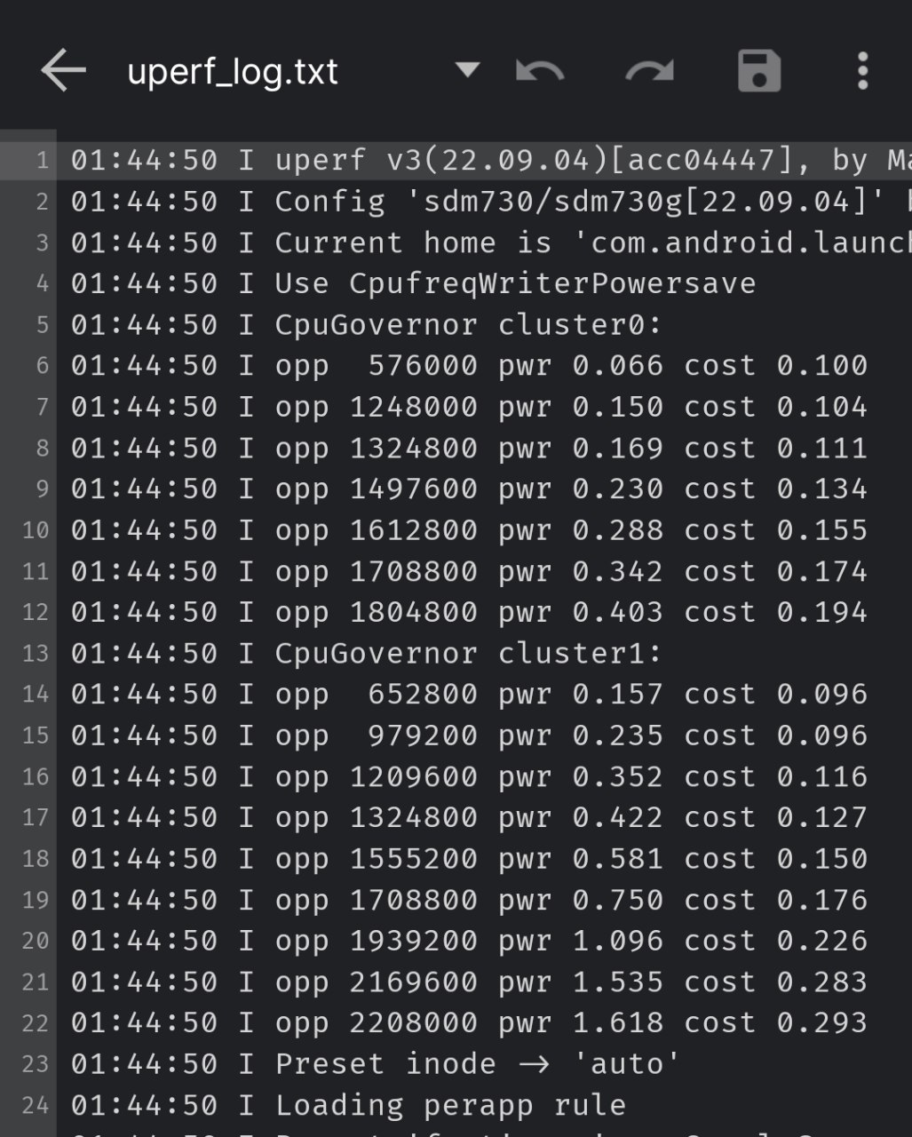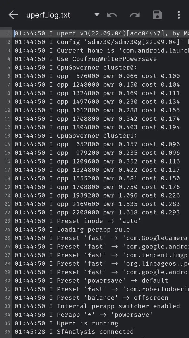 大部分报错都是因为装用的第三方内核修改过调度导致不兼容,或另外安装了类似的性能调度类 Magisk 模块造成冲突。如果我们修改分应用性能配置文件,无需重启手机,Uperf 会实时应用新的设置,这些改动也会反映在 uperf_log.txt 文件中。