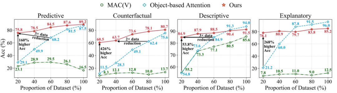 此外,它具有极高的数据利用效率,仅使用 20% 的数据就可以得到相当不错的结果,远超现有的其他方案,如下图所示。