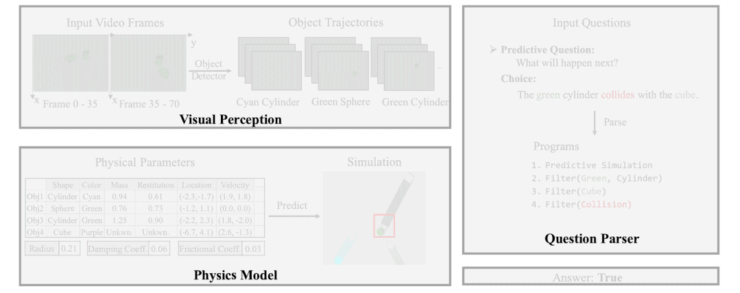 本文作者发现,现有方案的弊端是没有显式的使用物理模型,而是过于依赖神经网络或 GNN 的隐式推理,这导致他们在长期预测和反事实推理中无法很好的捕捉视频中的逻辑。基于此,作者引入了一个可微的物理引擎,并通过从视频中捕捉到的物体轨迹和属性来还原视频中物体和场景的物理参数(速度,加速度,质量,弹性系数,摩擦力等)。一旦所有的相对物理参数被推理出来,即得到了显式的物理模型后,作者使用物理模型进行基于预测的和反事实的物理模拟,并根据模拟后的轨迹和特征来回答相关问题。具体流程如下图所示。