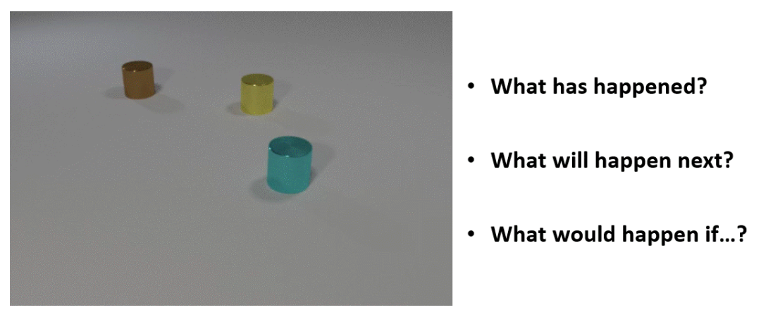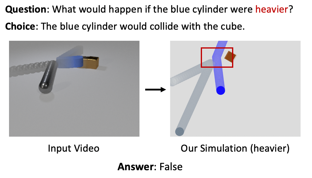图 3. 基于物理模型的推理示例。(1)使用一个感知模块从视频中获取每个物体及其对应的轨迹和属性;(2)利用上述视频观测通过可微物理模拟来学习相关物理参数;(3)通过物理模拟进行预测并回答相关问题。