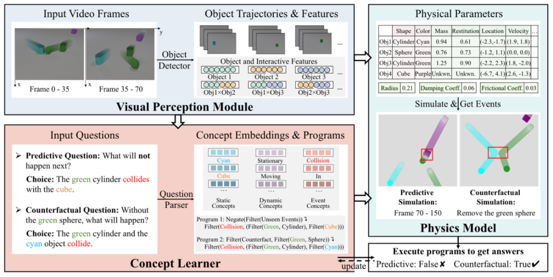本文提出的基于可微物理模型的神经符号推理框架很好的解决了这个问题,它通过从视频和问题对中学习物理模型,并利用显式的物理模型对物体动力学进行建模,基于准确的动力学预测来回答长期和反事实预测问题。本文的框架透明可解释,并在