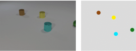 本文使用最多的数据集是 CLEVRER 数据集 [2]。如下图所示,它使用简化的物体(圆球,圆柱,正方体等)来学习动力学相关的推理问题:1. 发生了什么 ?(Descriptive question); 2. 为什么发生?(Explanatory question); 3. 将会发生什么?(Predictive question); 4. 如果… 会发生什么 (Counterfactual question)。人类可以比较轻松地利用物理直觉和常识来推断这些问题,然而这对于机器来说就有些困难了,尤其是 Counterfactual 的问题,例如,假设没有黄色的金属圆柱,会是怎样的情形?这很考验物理建模和空间想象的能力。即使基于 Transformer 的模型可以很好的解决 Descriptive 和 Explanatory 问题,它们也总是会在 Counterfactual 的情形中失败。