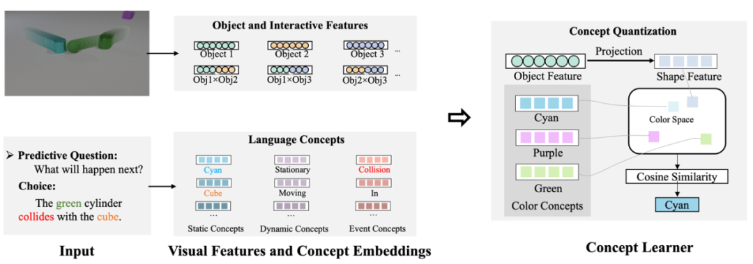 具体来说,框架中的物理引擎为一个基于动量和动能守恒的碰撞模型,它从单个视频轨迹中估计物体的实时速度和加速度,并以此估计场景的摩擦力等参数。此外,它通过碰撞事件来估计碰撞物体的相对质量和弹性系数,一旦这些参数学习完成,它便可以自由地进行各种模拟和推理。本文的概念学习器为问题中的每个概念词分配一个编码(embedding),并从视频轨迹中学习物体感知的特征,通过讲视觉特征和语义编码投影到同一空间下并检索来得到每个物体对应的属性,参考 NS-CL [1]。如下图所示。