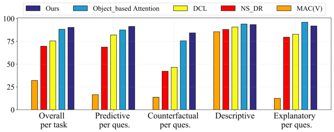 本文提出的 VRDP 框架具有优越的性能,在全部 CLEVRER 数据集上测试,它在更加困难的 Predictive 和 Counterfactual 两类问题上都取得了最高的性能,在 Descriptive 和 Explanatory 问题上也得到了有竞争力的结果,如下表所示。