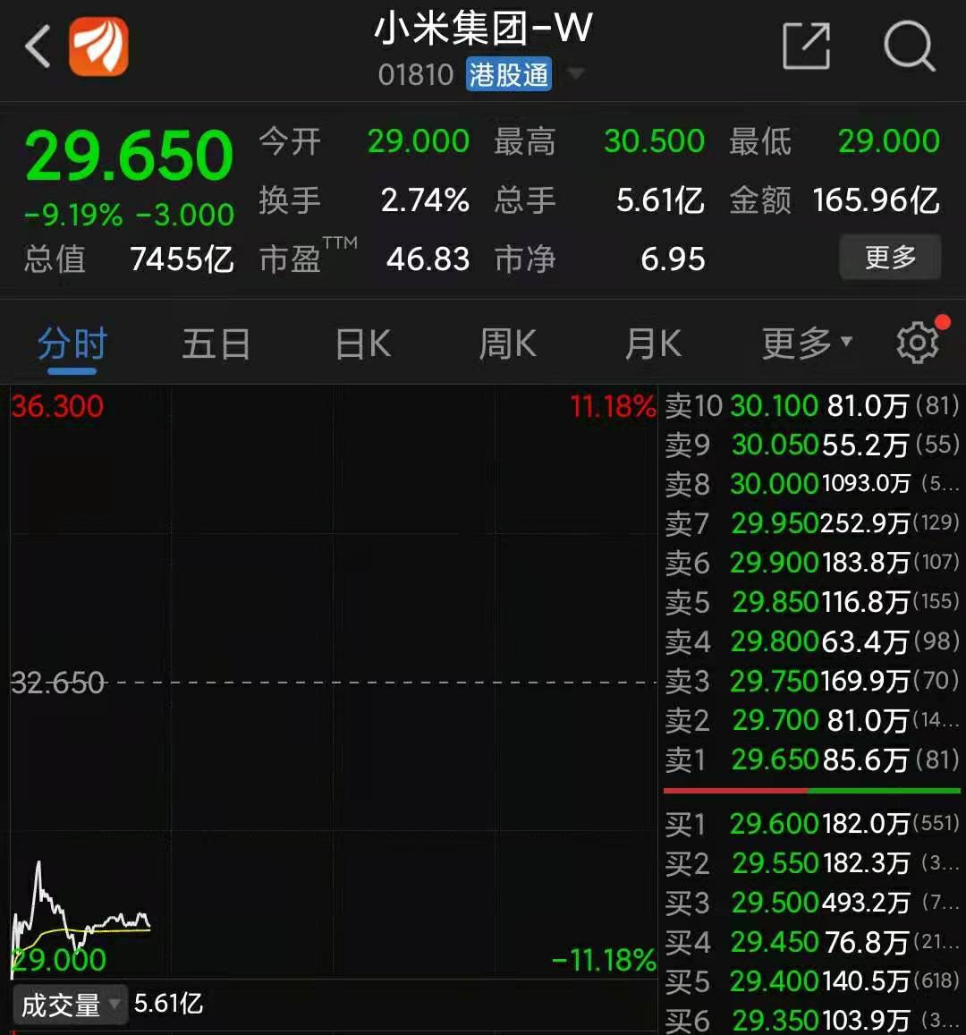 不过,受此消息影响,小米股价今日低开低走,一度下跌超9%。