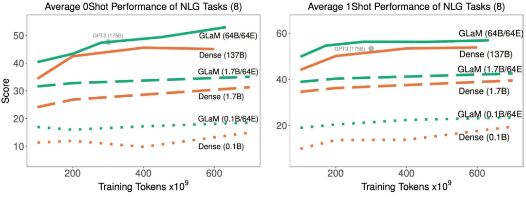 NLG(左)和 NLU(右)任务上,GLaM 和 GPT-3 的平均得分(越高越好)。