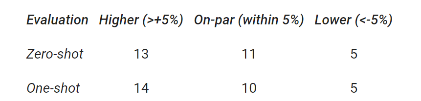 谷歌总结了 29 个基准上,GLaM 与 GPT-3 的性能比较结果。结果显示,GLaM 在 80% 左右的 zero-shot 任务和 90% 左右的 one-shot 任务上超越或持平 GPT-3 的性能。