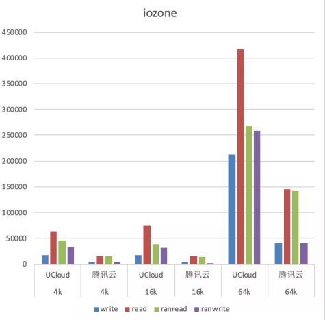 可见,UCloud快杰云主机在各项具体指标中均大幅领先。在4K/16K的随机写两项指标下,快杰型的数据甚至达到了腾讯SA2型的 11 倍和 12 倍。
