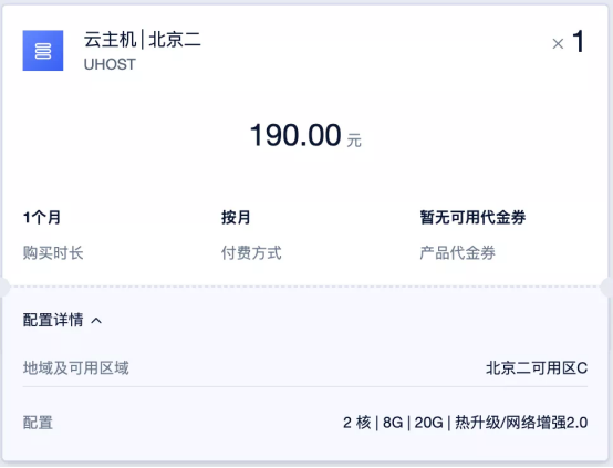 在价格查询时,我们发现,由于进入UCloud主机创建页时,若不调整选项,默认带1Mb外网带宽和20GB数据盘,三个配置项叠加的总价和《选型指南》表中展示的一致。以2核8G举例,227元/月正是在《选型指南》列出的UCloud快杰型价格。