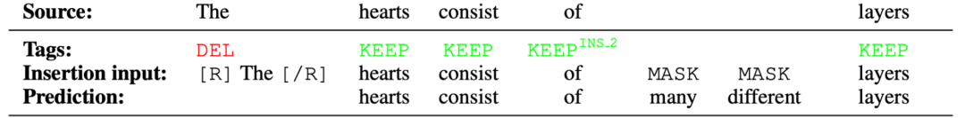 标记模型的输出是经过重新排序的输入文本,其中包含被删除的单词以及由插入标记预测的 MASK 符号。插入模型必须预测 MASK 符号的内容。因为 FELIX 的插入模型与 BERT 的预训练目标非常相似,所以它可以直接利用预训练的优势,这在数据有限时尤为有利。