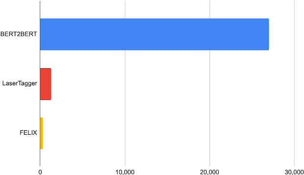使用 DiscoFuse 数据集比较模型在大小不一的训练数据集上的表现。我们将 FELIX(使用性能最佳的模型)与 BERT2BERT 和 LaserTagger 进行了比较