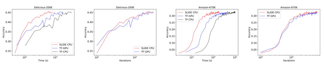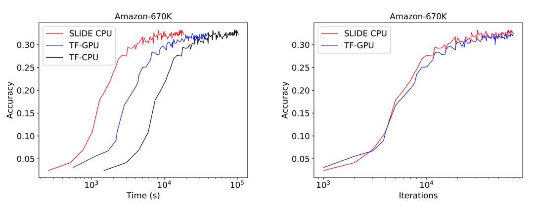 而在需要更大算力的 Amazon-670K 上,TF-GPU 的收敛时间是 SLIDE 的 2.7 倍(2 小时与 5.5 小时)。