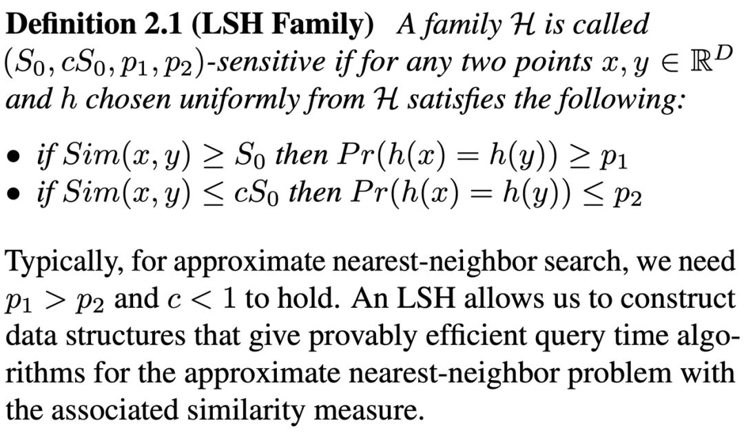 在 Indyk 和 Motwani 在 1998 年的一项研究中表明,对于给定的相似性计算,一类 LSH 函数就足以有效地解决次线性时间中的最近相邻搜索。