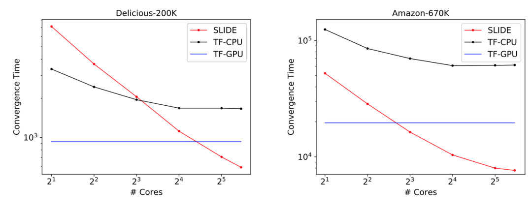 因为能高效利用 CPU 的计算资源,SLIDE 随着 CPU 核心数的 增加,收敛时间还能极大地降低。