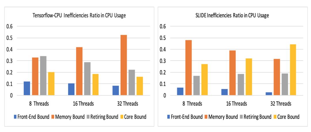 图 6:CPU 低效利用率:Memory-bound 的低效利用率(橙色)对于这两种算法是最显著的。TF-CPU 随着核心数的增加,Memory-bound 低效利用率也会增加,而 SLIDE 会降低。