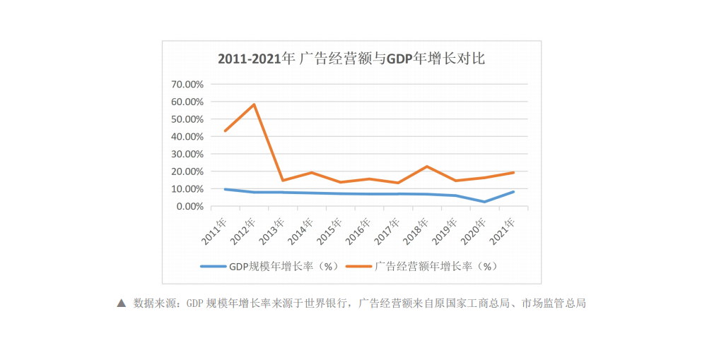 广告产业作为市场经济发展的产物,受宏观经济影响较大。2021年,我国GDP 同比增长8.1%,在第四季度出现经济增长势头减弱的趋势。进入2022 年,第一季度GDP同比增长4.8%。广告行业明显受经济下行影响,根据《2021 中国互联网广告数据报告》统计,2021年,互联网行业实现了广告收入 5,435 亿元(不含港澳台地区),同比增长9.32%,增幅较上年减缓了4.53个百分点。