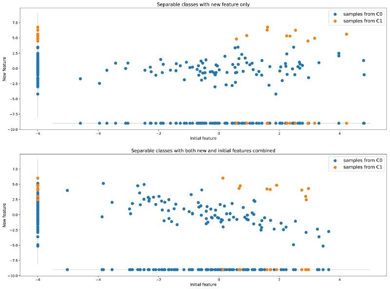 除了重采样外,我们还可以在数据集中添加一个或多个其他特征,使数据集更加丰富,这样我们可能获得更好的准确率结果。回到刚才的例子(两个类无法很好地分离开来),我们附加一个新的特征帮助分离两个类,如下图所示: