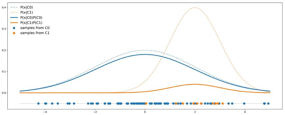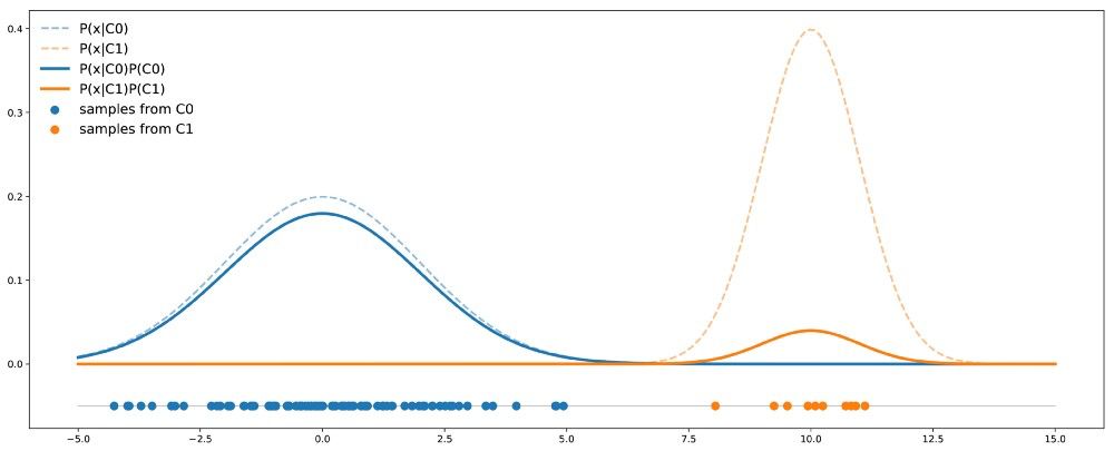 在这个例子中,我们可以看到 C0 的曲线总是在 C1 曲线之上,因此对于任意给定点,它出自 C0 类的概率总是大于出自 C1 类的概率。用贝叶斯公式来表示,即:
