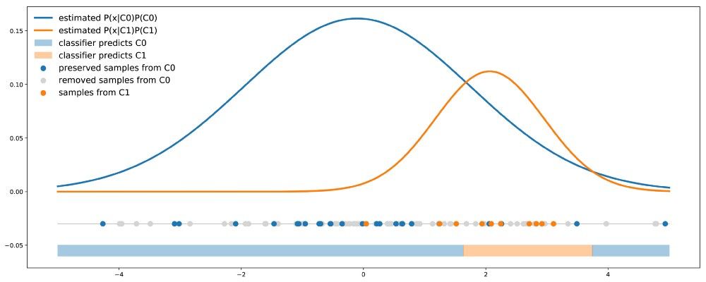 在这里我们可以清楚地看到先验概率的影响,以及它如何导致一个类比另一个类更容易发生的情况。这就意味着,即使从理论层面来看,只有当分类器每次判断结果都是 C0 时准确率才会最大。所以假如分类器的目标就是获得最大准确率,那么我们根本就不用训练,直接全部判为 C0 即可。