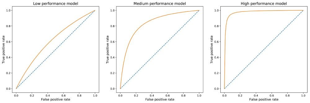 基于 ROC 曲线,我们可以构建另一个更容易使用的指标来评估模型:AUROC(Area Under the ROC),即 ROC 曲线下面积。可以看出,AUROC 在最佳情况下将趋近于 1.0,而在最坏情况下降趋向于 0.5。同样,一个好的 AUROC 分数意味着我们评估的模型并没有为获得某个类(通常是少数类)的高召回率而牺牲很多精度。