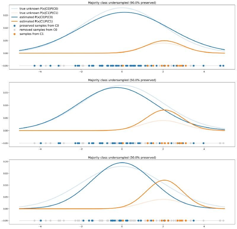 当使用重采样方法(例如从 C0 获得的数据多于从 C1 获得的数据)时,我们在训练过程向分类器显示了两个类的错误比例。以这种方式学得的分类器在未来实际测试数据上得到的准确率甚至比在未改变数据集上训练的分类器准确率还低。实际上,类的真实比例对于分类新的点非常重要,而这一信息在重新采样数据集时被丢失了。