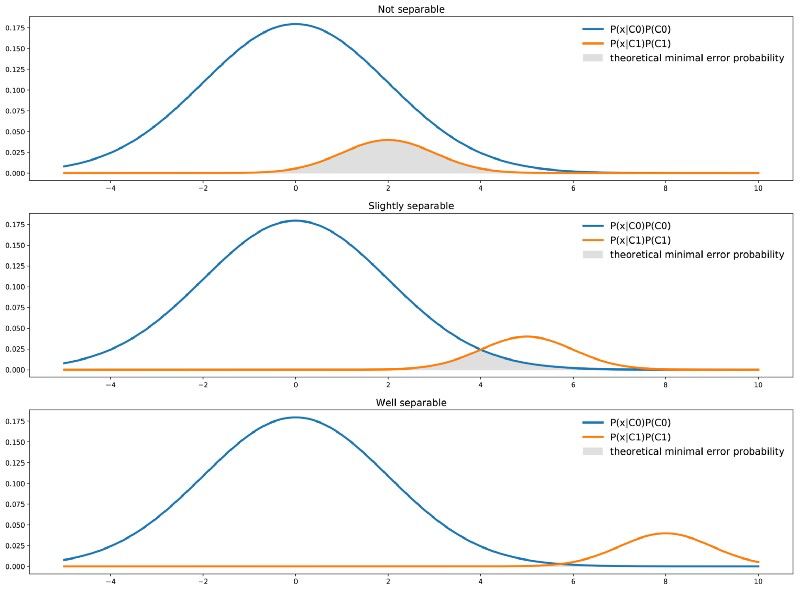 在这里我们看到,与前一种情况相反,C0 曲线并不总是高于 C1 曲线,因此有些点出自 C1 类的概率就会高于出自 C0 的概率。在这种情况下,两个类分离得足够开,足以补偿不平衡,分类器不一定总是得到 C0 的结果。