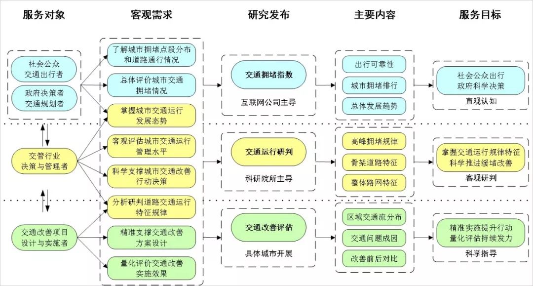将交通运行评估的服务对象细化为社会公众及政府决策者、城市交通管理决策及执行者、具体城市交通改善项目设计实施者三类,分析明确不同服务对象的客观需求、主要内容及服务目标。主要包括: