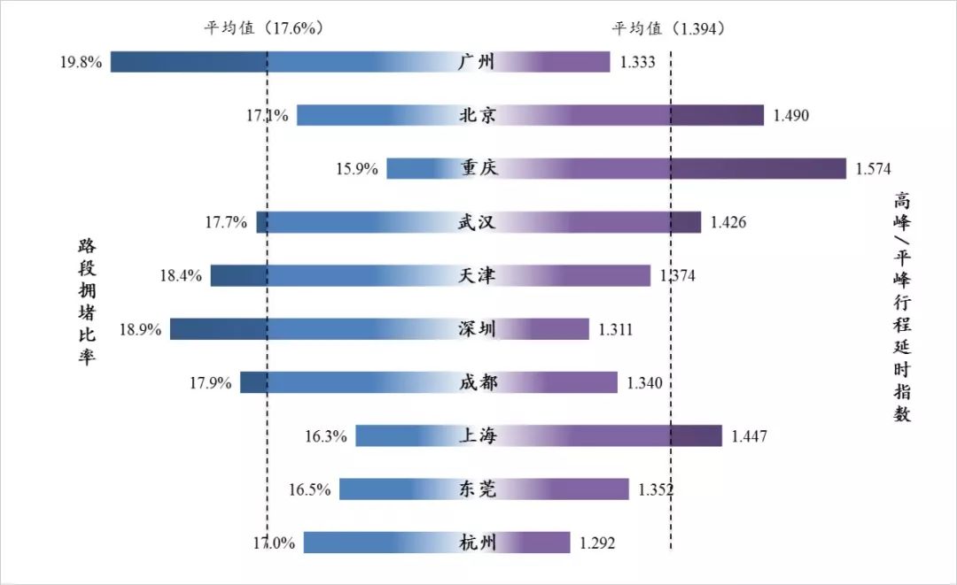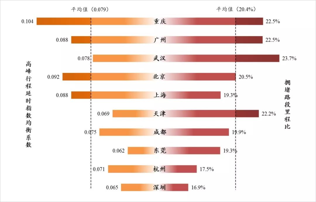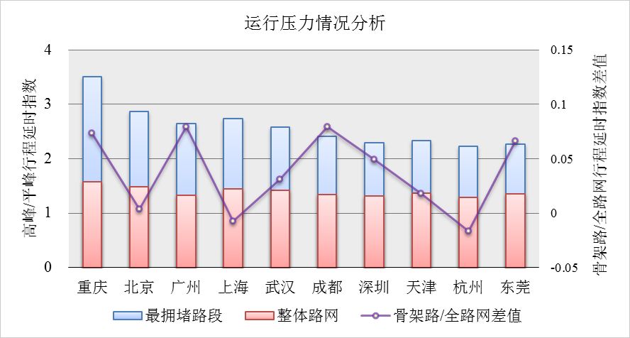 从高峰时期最拥堵路段的运行恶化情况来看,取城市全路网中最高峰小时内行程延时指数最大的5%路段指数值与整体路网指数值进行比较,可以发现重庆、北京、广州、上海的恶化程度更为显著。