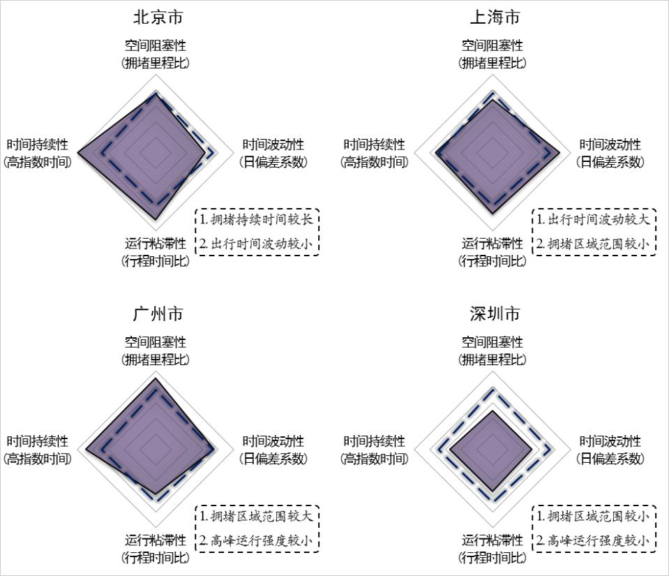 ❖ 典型城市运行状态画像:通过选择拥堵路段里程比、高峰/平峰行程延时指数、高峰运行速度日偏差系数、高行程延时指数持续时间四项指标,对北上广深四个典型城市交通运行态势的时间、空间、强度综合评估,图中顶点为同类城市中的最严重城市情况,虚线为同类城市的平均水平,得出了四个城市的画像标签: