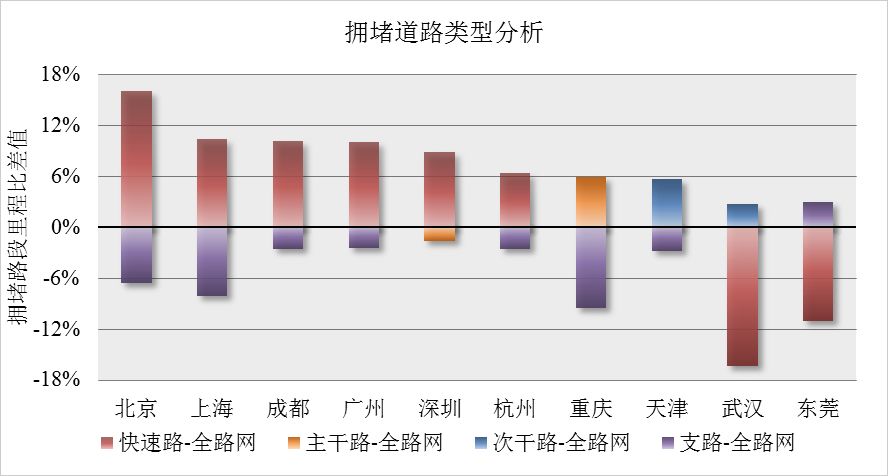 从不同道路类型的拥堵差异性来看,北京、上海、重庆、武汉不同类型道路的拥堵差异性较大,深圳、杭州、天津不同类型道路的拥堵差异性较小。