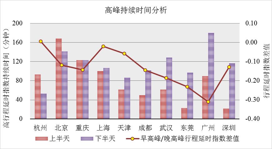 从最高峰小时运行情况来看,早晚最高峰小时的行程延时指数差值(图中右侧副坐标轴)显示高峰持续时间与交通运行压力的一致性,即对于同一城市而言,交通压力越大则高峰持续时间也越大,这一现象在广州、东莞、武汉更为明显。