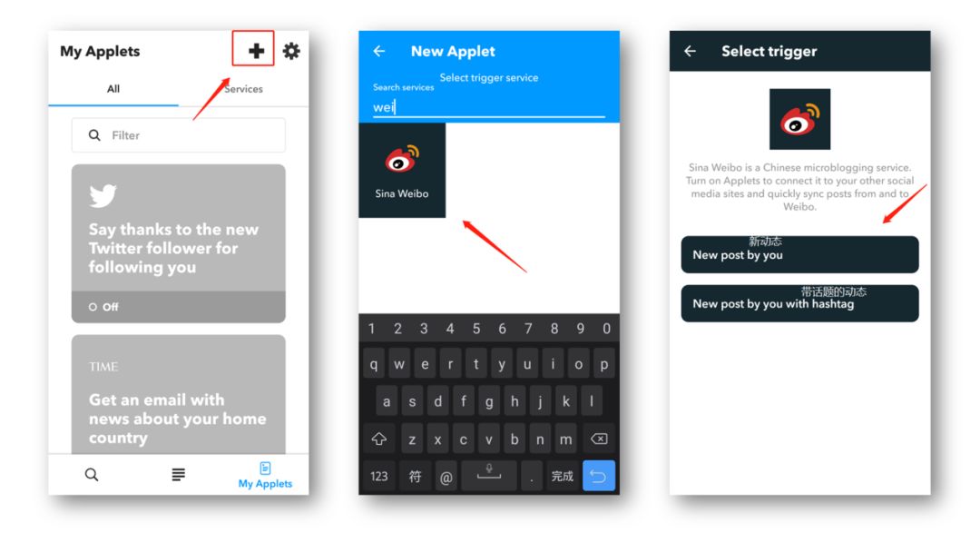 注意:以上步骤省略了 IFTTT 关联你的账号信息,建议在新建 Applet 的过程中先在手机上安装好微博和 FaceBook 并登录账号,方便 IFTTT 跳转关联。