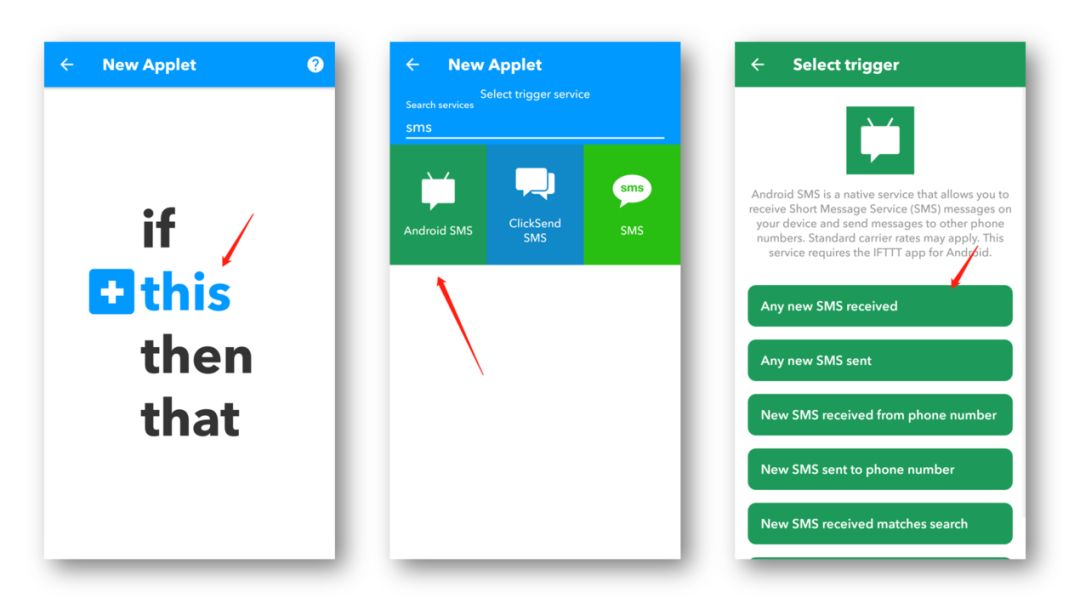 1、 打开 IFTTT 新建 Applet ,点击 " this " 在 services 中搜索找到 Android SMS ,选择第一项“ Any new SMS received (任何新收到的短信)”