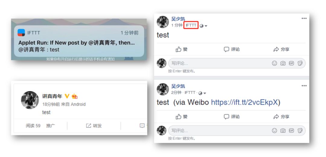 完成之后,发一条微博测试一下,如果能够同步到脸书,就算成功了。如果你有其他 Applet 也是相同功能的话,它也会同步(如图)。当然,如果你想把微博同步到其他平台,也可以依样画葫芦,创建一个新 Applet 。
