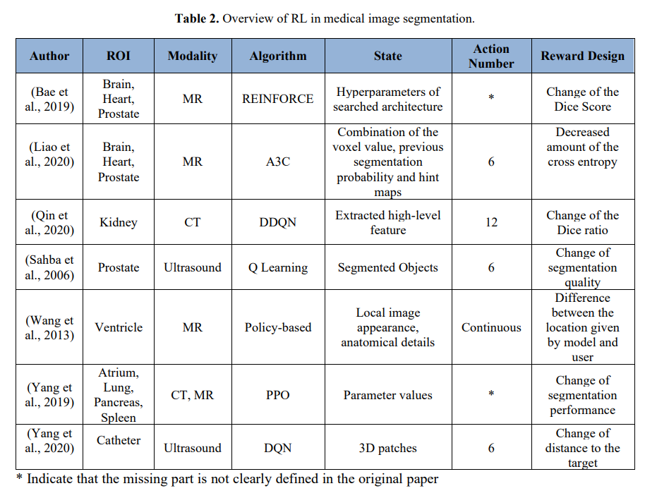 医学影像分析的任务是协助医生对病变或解剖结构进行定性和定量分析,显著提高诊断和预后的准确性和可靠性。传统上,这些工作都是由医生或医学物理学家完成的,这导致了两个主要问题: (1) 效率低; (ii) 个人经验的偏见。在过去的十年中,许多机器学习方法被用于加速和自动化图像分析过程。与大量部署的有监督和无监督学习模型相比,在医学图像分析中使用强化学习的尝试非常少。本文可作为相关研究的基础。
