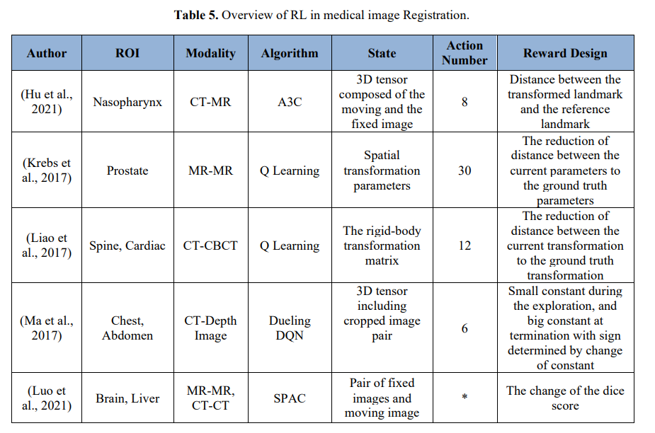 图像配准是将两幅不同的图像转换为相同坐标的过程。在医学成像领域,注册可以是患者间、患者内(但在不同的时间点)、多通道(如MRI、CT、CBCT、超声)、多维间(2D-3D)。转换模型也可以根据配准对的属性而变化。它通常可以分为刚性变换、仿射变换和可变形变换,其中刚性变换是使用参数模型实现的最简单的一种。传统的配准方法是通过优化相似度来完成的。然而,医学图像的高维和组织的变形和伪影使得这种方法不稳定,有时甚至是不可行的。基于agent的方法的出现从一个完全不同的角度解决了注册问题- MDP过程的制定。在RL代理的控制下,配准任务实现了前所未有的鲁棒性和精度。