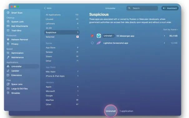 MacPaw 在 CleanMyMac 的卸载程序中添加了一个新类别——可疑,即一旦 Mac 上存在由俄罗斯或白俄罗斯开发或托管的应用,CleanMyMac X 就会将它们标记为可疑。具体查看方式为: