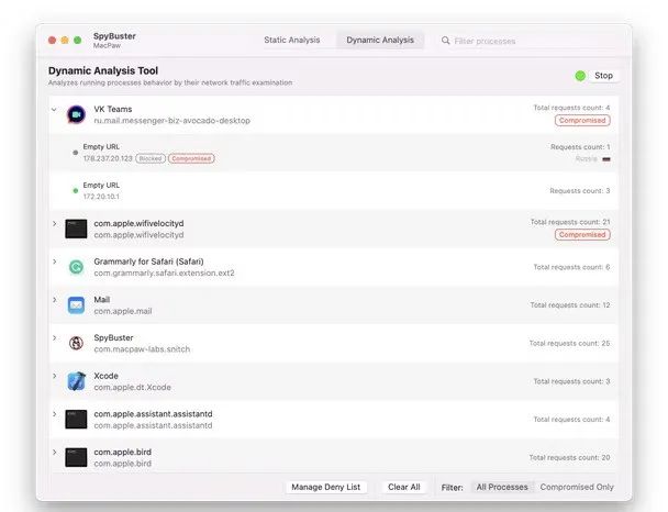 动态分析则可显示 Mac 在运行相关应用和网站时的行为方式,包括向服务器发送消息、写入文件、获得访问权限等。通过点击“Compromised Only(仅受威胁)”选项,用户可查看潜在威胁连接并选择禁用。