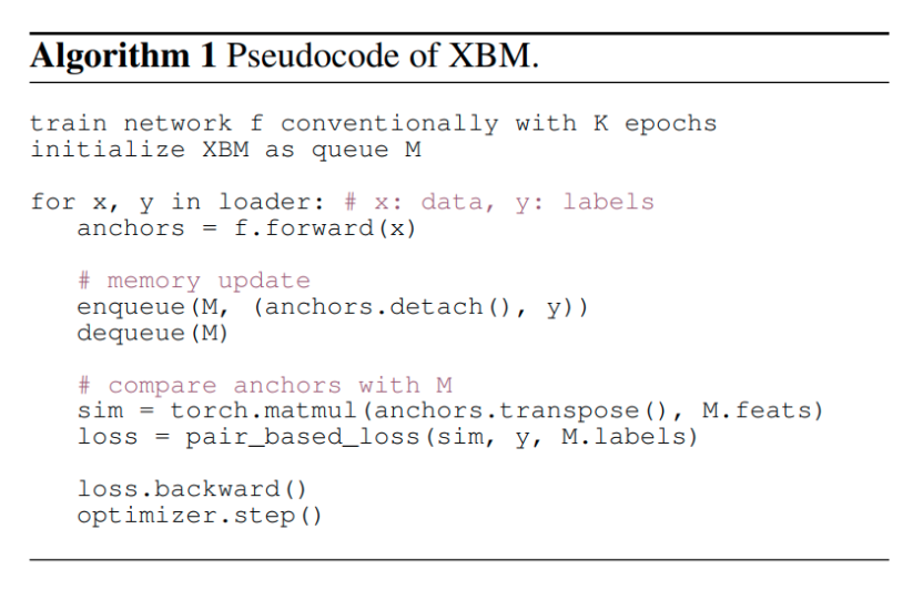 不难发现,XBM 其实直接和过去基于样本对的方法结合,只需要把原来的 mini-batch 内的样本对换成当前 mini-batch 和 XBM 的特征构成的样本对就可以了。所以,我们通过 XBM 这种存储特征的机制,能够让不同时序的 mini-batch 的特征成功配对。