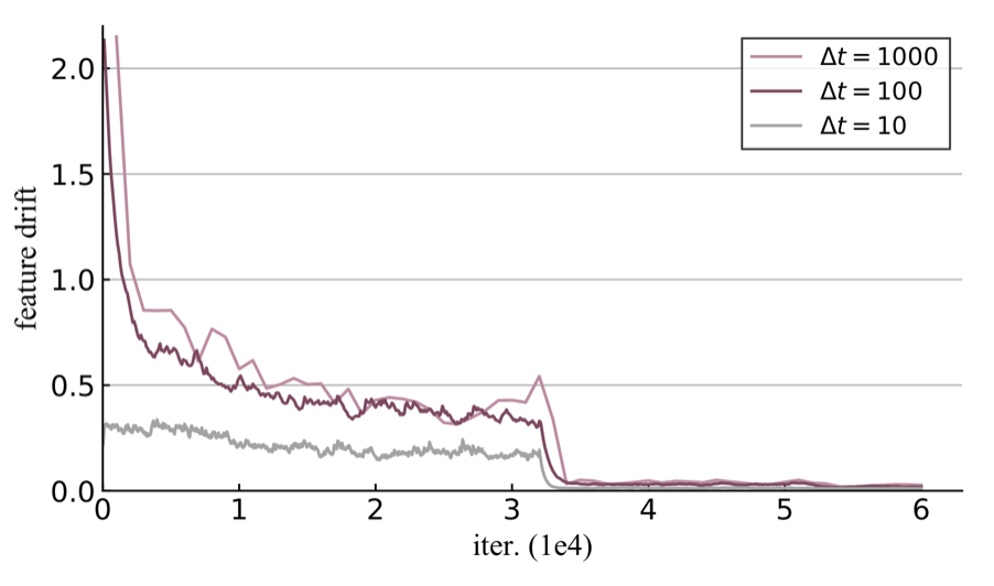 我们将样本特征随着模型训练的偏移量,称之为特征偏移(Feature Drift)。从上图我们发现,在训练的一开始,模型还没有稳定,特征剧烈变化,每过 100 次迭代,特征偏移大约 0.7 以上。但是,随着训练的进行,模型逐步稳定,特征的偏移也变小。我们称这个现象为慢偏移(Slow Drift),这是我们可以利用的一点。