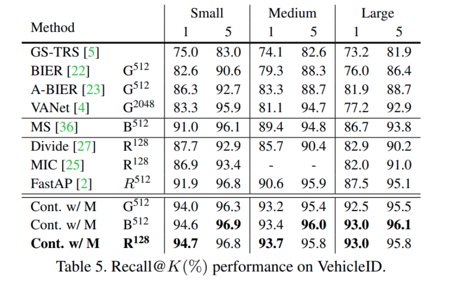与最近的深度度量学习方法对比,我们在四个检索数据库上效果均大幅提升,这里仅列出 VehicleID 的效果,其他数据集的效果见原论文。